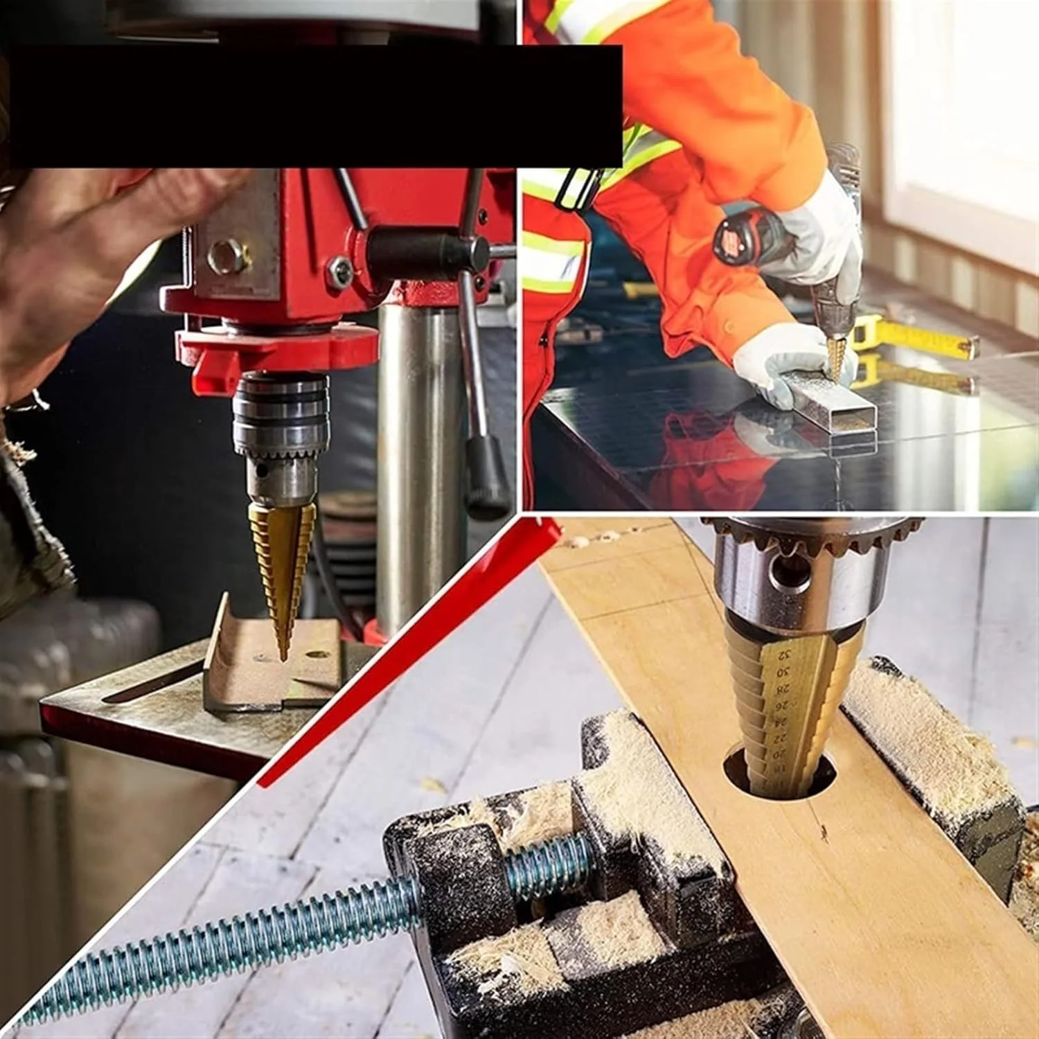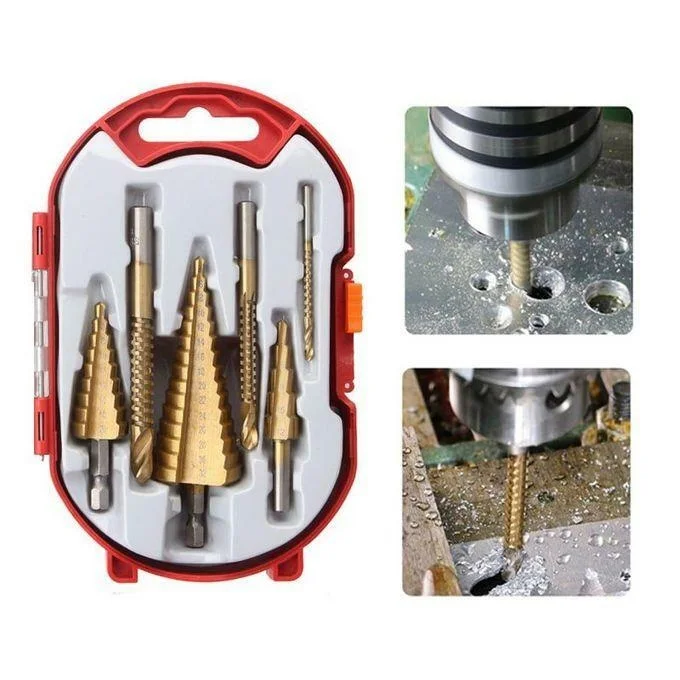 Le kit comprend 6 pièces : 4–12 mm, 4–20 mm, 4–32 mm + forets droits de 3 mm, 6 mm et 8 mm, pour tous vos besoins de perçage.